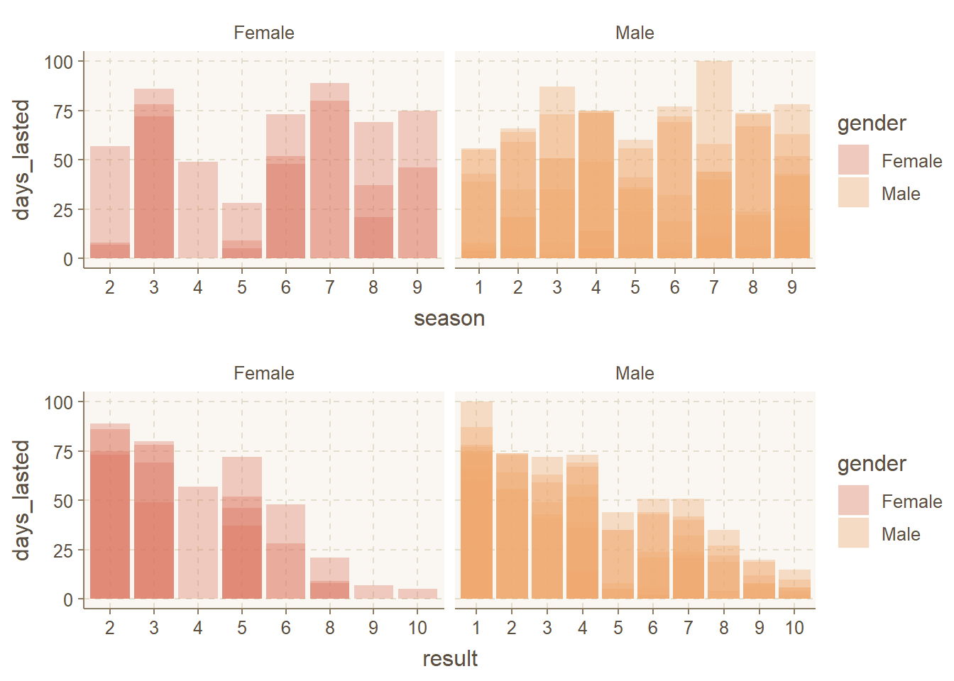 After diving into the Alone Tidy Tuesday data set, I conducted an analysis to examine the survival rate of men and women participants. I specifically looked at the reasons behind contestants being medically evacuated or leaving for medical health or personal family reasons, and investigated if there were any significant differences in survival rates between genders. Interestingly, I found that there was a 50% higher chance for female participants to outlast males (approximately 60 days longer) due to family or personal reasons. This finding sparked my curiosity and I believe it opens up potential discussions. I encourage you to share your thoughts below so that we can delve into more detailed analysis.