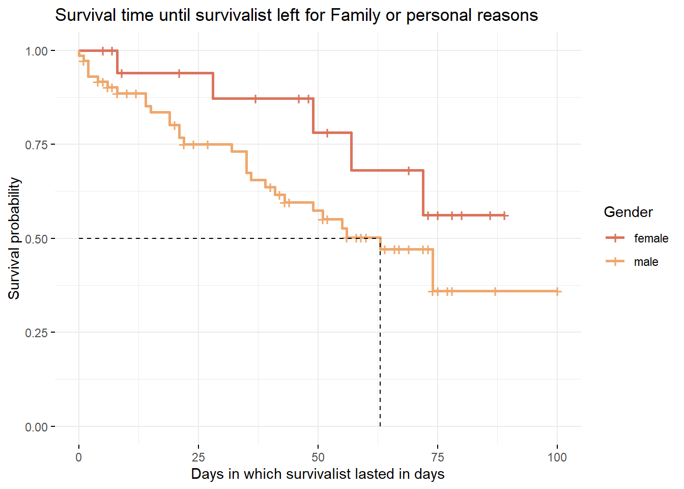 In my continued exploration, I wanted to investigate the survival rates between men and women using a Kaplan-Meier Curve. I focused on three categories: medically evacuated, departed for medical health, and left for personal or family reasons. As I delved into the data,I used right censoring of the survival time of men and women and found significance specifically related to leaving for personal or family reasons among men. It became evident that men in these situations had a lower chance of survival compared to women. This finding suggests that leaving for personal or family reasons might have different impacts on survival for men and women. To gain a deeper understanding of why this difference exists, further research is needed.