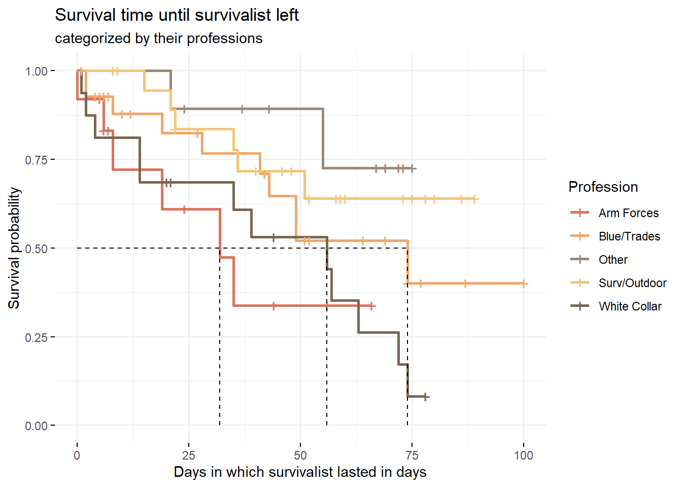 Additionally, I decided to explore the professions of the participants and investigate if there were any notable disparities in survival rates among different occupational categories. I classified the professions into white-collar workers, outdoor survivalists, blue-collar tradesmen, armed forces, and others, predominantly entrepreneurs. The analysis revealed that outdoor survivalists and blue-collar tradesmen had a higher likelihood of surviving longer compared to armed forces and white-collar workers. This finding was fascinating as it validated certain assumptions about survival skills, and I was thrilled to have data-backed evidence supporting these assumptions.